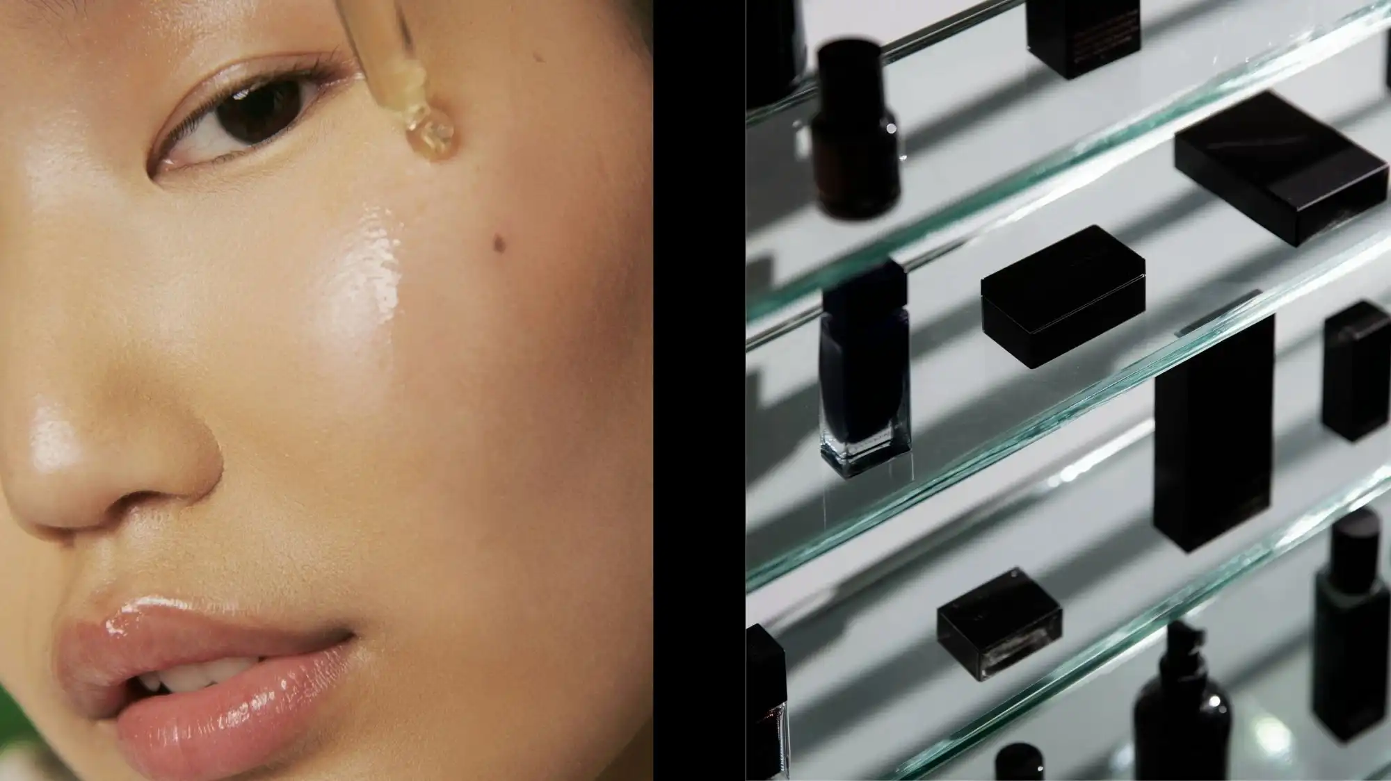 Minimalist black skincare and wellness containers displayed on glass shelves, symbolizing longevity culture, science-driven vitality, and future wellness aesthetics explored by C2 Fashion Studio.