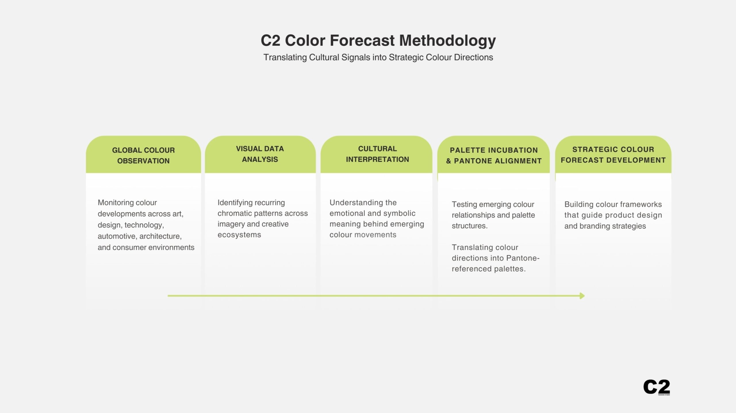 At C2 Fashion Studio, colour forecasting is integrated within the broader trend intelligence framework and follows a similar research logic.